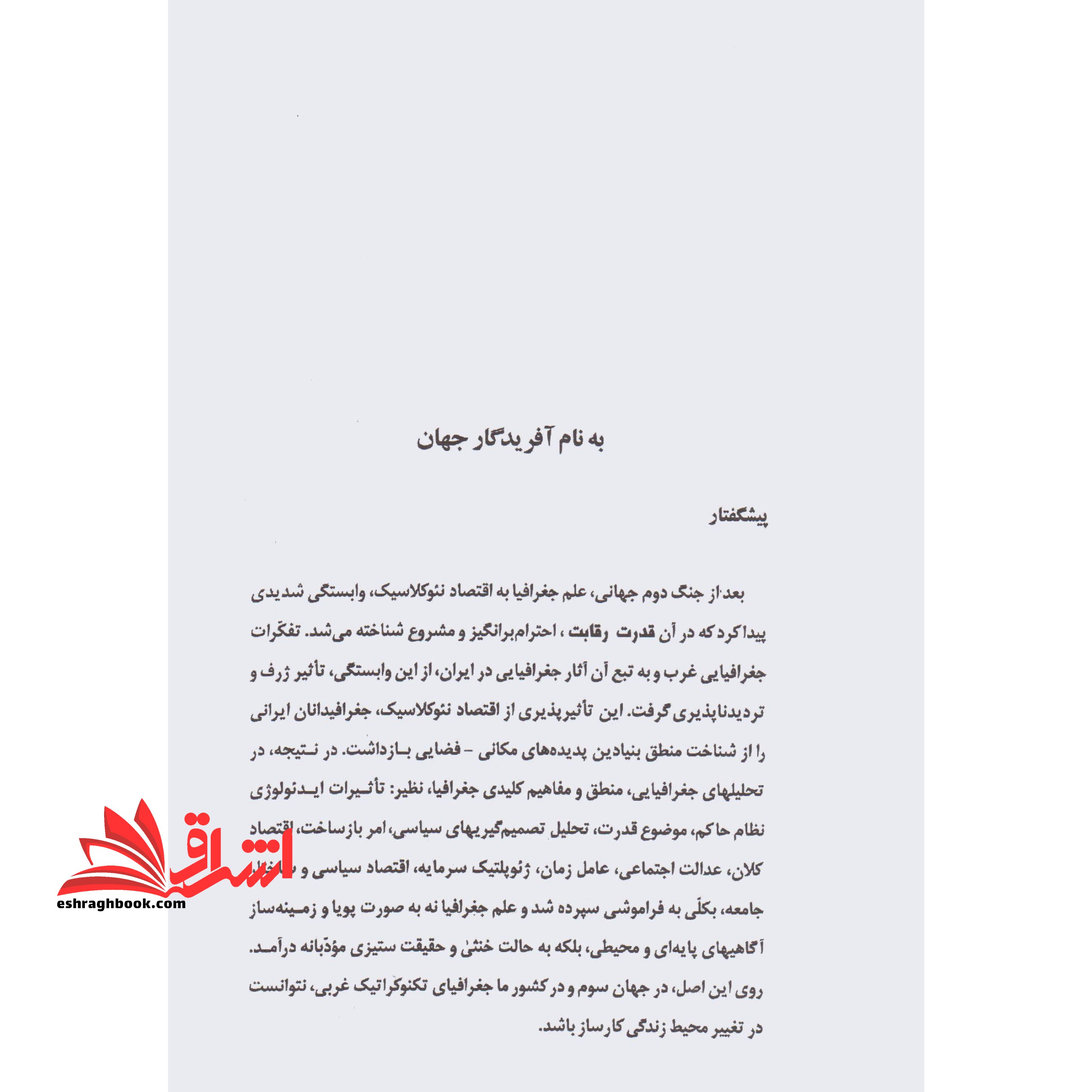 توضیحات تالیف دکتر حسن شکوئی و چاپ انتشارات گیتا شناسی می باشد. ارتباط یافتن جغرافیا با اقتصاد نئوکلاسیک پس از جنگ جهانی دوم به وقوع پیوست. این مسئله جغرافیای ایران را همانند تفکرات جغرافیای غرب تحت تاثیر خود قرار داد، اندیشه ای شکل گرفت که در آن قدرت رقابت پسندیده بود و در نتیجه آن علم جغرافیا پویایی خود را از دست داد و به حالت خنثی و حقیقت ستیزی در آمد. آنچه که اکنون واضح است تاثیر پذیری جغرافیا از عوامل سیاسی و اقتصادی است، و در صورتی که این مهم با جغرافیای نظری همراه نگردد کارساز نیست. در کتاب حاضر سعی بر این است، که آخرین تحولات فلسفه جغرافیایی و فراز و فرودها دیدگاههای جغرافیایی با صداقت و بدون جبهه گیری نشان داده شود تا شاید وجدان جغرافیدانان بیدارگردد و زندگی انسان ها به گونه ای شکل گیرد که با شان و مقام آدمی همخوانی داشته باشد.با در نظر گرفتن ماهیت چند متغیره ی نظامهای جغرافیایی، مشکل دیگر، وام گیری نظریه ها از سایر رشته های علمی است. این امر، ممکن است کاربردی، ترکیبی یا تحویلی باشد و اگر این وام گیری نظریه ها، از بیش از یک رشته علمی صورت بگیرد شاید با مشکلات بیشتری روبرو شویم. زیرا هریک از رشته های علمی، دارای مقیاس خاص تحلیلی، مفهومی و تعریفی است. از این رو، امکان دارد که نتوانند با یکدیگر سازگار باشند و به یکسان عمل کنند. بی جهت نیست که عده ای پیشنهاد می کنند تنها تفکر منطقی در این باب، همانا تطبیق دادن نظریه های یک رشته علمی به عنوان منبع اصلی نظریه، در موضوع و یا شاخه خاص در جغرافیاست.