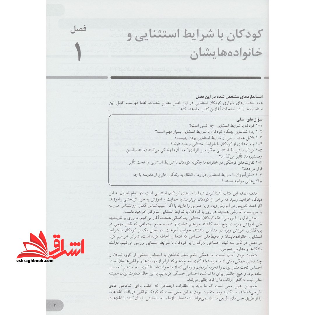 توضیحات نوشته ساموئل کرک، جیمز گالاگر و ماری روث کولمن است به ترجمه دکتر رقیه اسدی گندمانی و دکتر عباس نسائیان که توسط انتشارات دانژه به چاپ رسیده است. این مجموعه که در سیزده فصل تدوین شده، ابتدا مروری بر کودکان با شرایط استثنایی و خانواده های آن ها و نقشی که نهادهای اجتماعی در قبال آن ها ایفا می کنند، دارد و در ادامه تاریخچه، تعریف، علت یابی، ویژگی ها و چگونگی شناخت شرایط استثنایی با فراوانی بالا و پایین را در افراد مورد بررسی قرار می دهد. در این کتاب چگونگی آموزش به کودکان با شرایط خاص تبین می گردد و نحوه انتقال آن ها از مدرسه به کار و جامعه مورد بحث واقع می شود.اگر ما کودک با شرایط استثنایی را به عنوان شخصی تعریف کنیم که در برخی جهات از گروه هنجار متفاوت است، پس بسیاری از کودکان استثنایی هستند. اگر سایر کودکان کلاس موی بلوند، قهوه ای یا سیاه داشته باشند، کودکی با موی قرمز «استثنایی» به حساب می آید. کودکی که یک فوت از همسالانش بلندتر است «استثنایی» است. این تفاوت ها اگرچه برای متخصصین ژنتیک جالب توجه است اما به معلم ارتباط کمی دارد. از دیدگاه آموزشی، دانش آموزان به عنوان «استثنایی» مدنظر قرار نمی گیرند، مگر اینکه لازم باشد، برنامه آموزشی برای کمک به آن ها تغییر کند. اگر استثنایی بودن به این معنی باشد که کودک برای خواندن یا تسلط یافتن بر یادگیری به حمایت بیشتری نیاز دارد یا اگر نسبت به همسالانش خیلی جلوتر است، به صورتی که آنچه آموزش داده می شود نیازهایش را برآورده نمی کند یا توانایی سازگاری با شرایط اجتماعی کلاس را ندارد، در این صورت روش های آموزشی ویژه ضرورت پیدا می کند.
