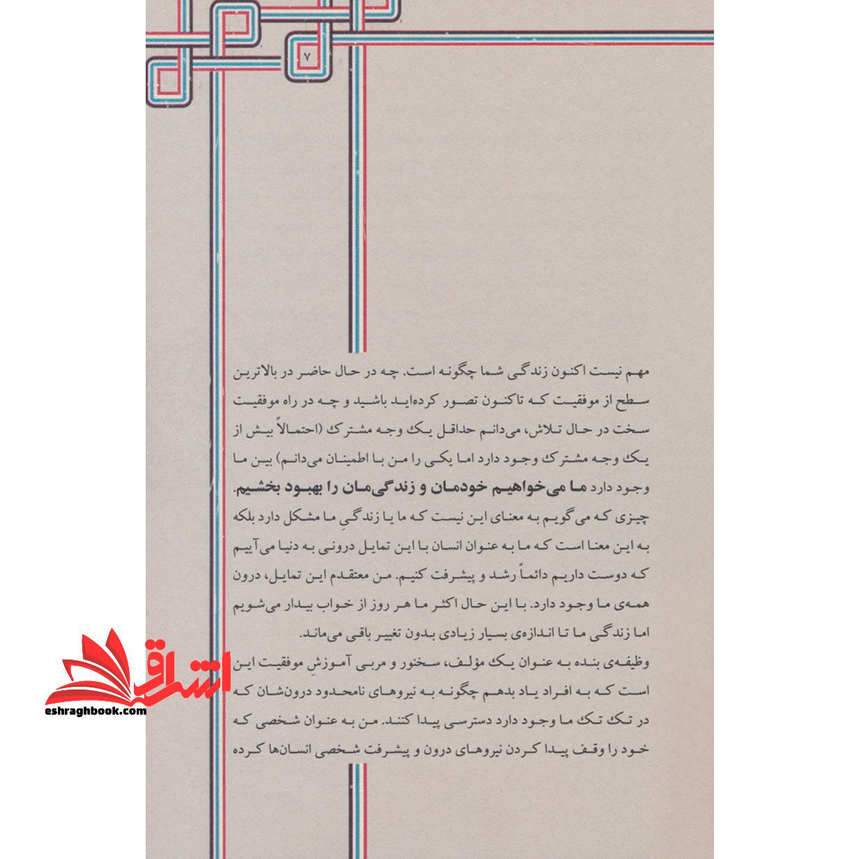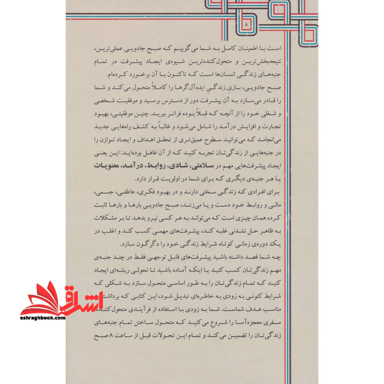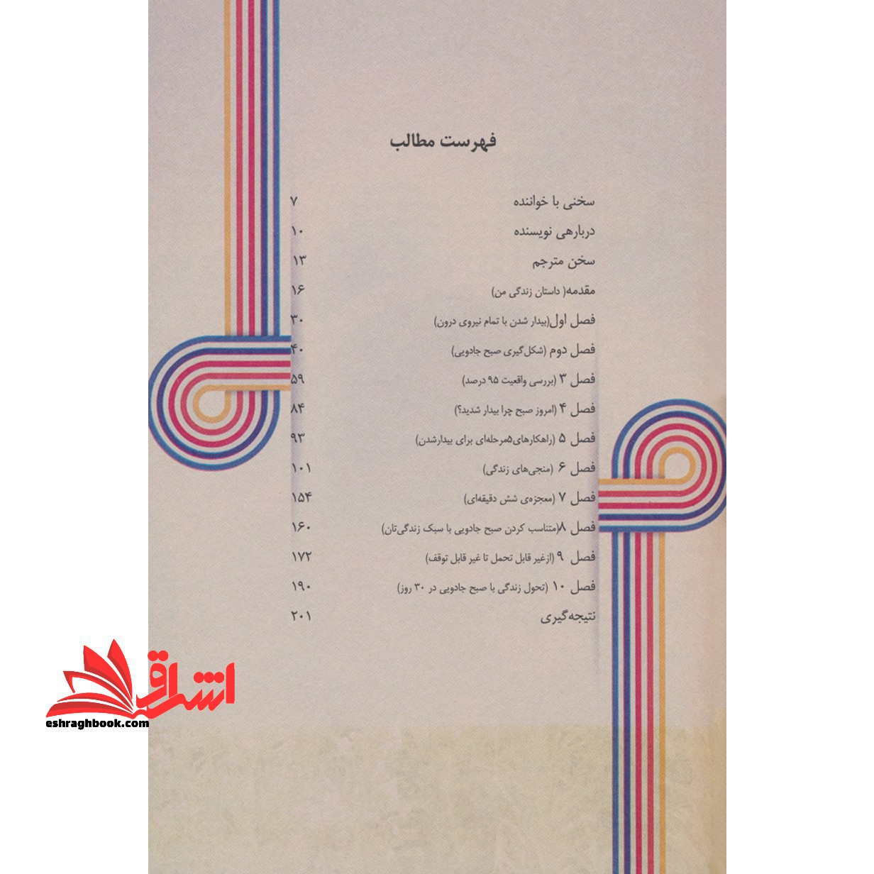 توضیحات نوشته ایست از هال الرود به ترجمه مهران زهره بخش و چاپ انتشارات الماس پارسیان،سلیس. این کتاب برای تحول زندگی تان و دستیابی به نیروی نامحدود درونی تان نگارش شده است، اثری که دستیابی به پیشرفت هایی مهم را در سلامتی، شادی، روابط، درآمد و معنویات به دنبال می آورد و توانایی خروج از هر نوع مشکلی که اکنون با آن دست و پنجه نرم می کنید فراهم می کند. “هال” در “صبح جادویی” با استفاده از زندگی واقعی خود و کارهایی که در عمق ناامیدی انجام داده و او را به پیشرفتی همه جانبه رسانده مخاطب را حیرت زده می کند و در مسیر تغییری مثبت قرار می دهد.در زندگی اکثر ما شکاف عمیقی در نیروهای درون مان وجود دارد: شکافی که آنچه هستیم را از آنچه می توانیم باشیم جدا می کند. بنابراین اغلب از خودمان نا امید می شویم، انگیزه ی ثابتی نداریم، در یک یا حتی چند جنبه از زندگی تلاش نمی کنیم و نتیجه ای عایدمان نمی گردد. زمان بسیاری را صرف فکر کردن درباره ی کارهایی می کنیم که باید انجام دهیم تا نتایجی که می خواهیم نصیبمان گردد اما آن کارها را انجام نمی دهیم. همه ما می دانیم چه کارهایی لازم است انجام دهیم فقط آنچه را که می دانیم منظم و پیوسته انجام نمی دهیم. درست است؟
