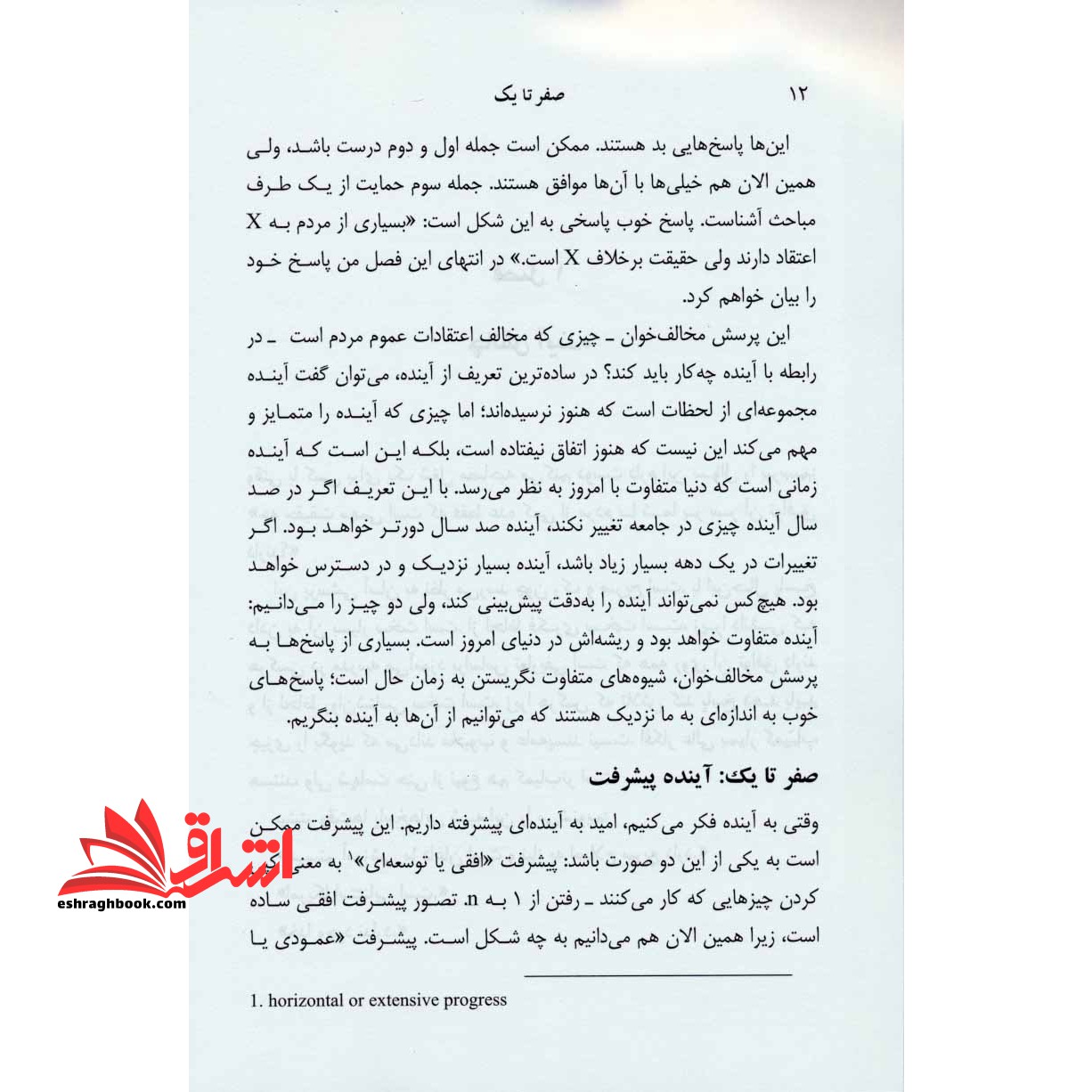 معرفی کتاب صفر تا یکصفر تا یک اثر پیتر تیل و بلیک مستر کتابی در زمینه مدیریت کسب و کار است که نوشتارهایی درباره استارت آپ ها و چگونگی خلق آینده با آن ها دارد. کتاب توسط فرهنگ فشارکی جعفری و پریوش طلایی.درباره کتاب صفر تایکاین کتاب می گوید هربار که چیز تازه ای ابداع می کنیم درواقع از صفر به یک رسیده ایم و این دستاوردی بزرگ است که با تقلید از دیگران تفاوت دارد پس بهتر است به جای پیروی از تکنیک های گذشته و تقلید از آنچه دیگران خلق کرده اند، با معجزات و نوآوری های فناوری در کسب و کار آشنا شویم.صفر تا یک درباره فناوری های حوزه کسب وکارهای اینترنتی و استارت آپ ها صحبت می کند. او در این اثر تجربه ها و آموخته هایش درباره راه آندازی و مدیریت خلاقانه استارت آپ را با خواننده قسمت می کند.کتاب صفر تا یک را به چه کسانی پیشنهاد می کنیمنویسندگان اثر می گویند این کتاب برای مخاطب دانشجویان نوشته شده تا به عنوان کتابی کمک آموزشی مورد استفاده آنان باشد اما صفر تا یک کتابی است که می تووانند برای همه کسانی که در سر سودای راه اندازی کسب و کارهای مدرن و استارتاپی را دارند مفید باشد.جملاتی از کتاب صفر تا یکپول، پول می آورد. «برای هرکس که توجه بیشتری داشته، فراوانی و وفور بیشتری خواهد آمد. کسی که تلاشی نداشته است، آنچه را در دست داشته هم از کف خواهد داد «(انجیل متا ۲5: ۲۹). آلبرت انیشتین هم مشاهداتی مشابه داشته است، هنگامی که اظهار داشت بهره مرکب «هشتمین مورد از عجایب جهان»، «بزرگ ترین کشف ریاضی تاکنون» و حتی «قدرتمندترین نیروی موجود در جهان» می باشد. هرکدام از این گفتارها را که ترجیح می دهید، پیامش یکی است: هیچ گاه رشد نمایی و تصاعدی را دستکم نگیرید. روشن است که هیچ گواهی مبنی بر گفتن این عبارات از زبان خود انیشتین وجود ندارد؛ تمامی این عبارات ساختگی است. اما این بهم ریختگی بسیار زیاد در واقع دارد پیام ها را تقویت می کند: در راستای سرمایه گذاری برای داشتن اصول درخشان همیشگی، انیشتین با دریافت اعتبار از چیزهایی که هیچ گاه به زبان نیاورد، به کسب جذابیت هایی فرازمینی خودش ادامه می دهد.فهرست کتاب صفر تا یکمقدمه؛فصل 1: چالش آینده؛فصل ۲: مهمانی به سبک سال 1۹۹۹؛فصل 3: تمام شرکت های خوشحال متفاوت هستند؛فصل 4: ایدئولوژی رقابت؛فصل 5: آخرین مزیت تکان دهنده؛فصل ۶: شما بلیت بخت آزمایی نیستی؛فصل ۷: به دنبال پول بروید؛فصل ۸: اسرار؛فصل ۹: بنیان ها؛فصل 10: مکانیک مافیا؛فصل 11: اگر آن را بسازید، آیا خواهند آمد؟؛فصل 1۲: انسان و ماشین؛فصل 13: مشاهده سبز؛فصل 14: تضاد بنیان گذاران.
