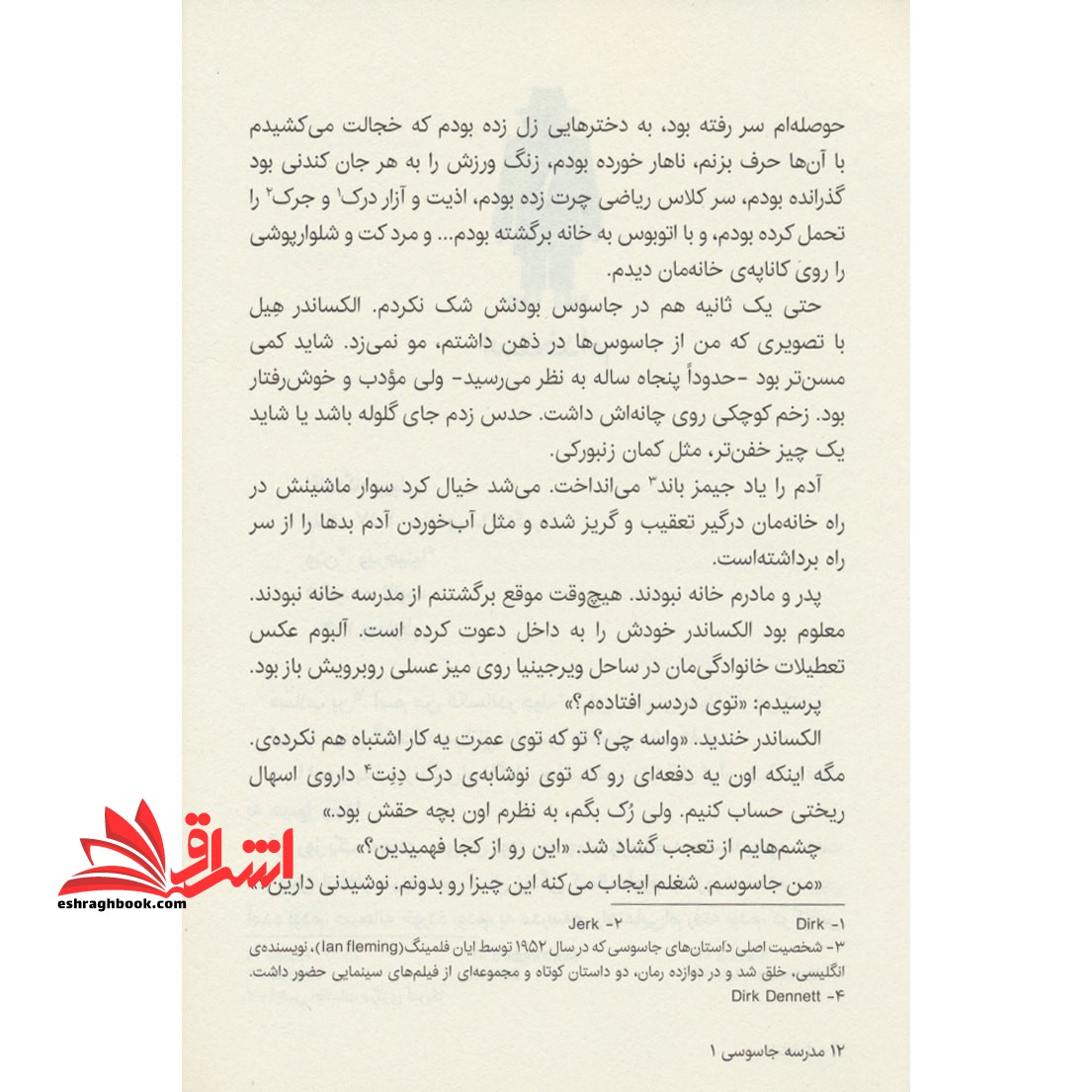 معرفی کتاب مدرسه ی جاسوسی؛ جلد اولکتاب مدرسه ی جاسوسی؛ جلد اول نوشته استوارت گیبز است. این کتاب را انتشارات پرتقال با ترجمه مریم رفیعی منتشر کرده است. در این کتاب می خوانید چطور یک دانش آموز ساده آموزش می بیند جاسوس باشد.درباره کتاب مدرسه ی جاسوسی؛ جلد اولاستان بِن ریپلیه، شاگرد ممتاز و نابغه ی ریاضی 1۲ ساله است. آژانس اطلاعات مرکزی آمریکا از او می خواهد به آکادمی فوق محرمانه ی اَبَرجاسوس های آینده بپیوندد. اما در حقیقت بن یک طعمه است برای بیرون کشیدن یک جاسوس دوطرفه و خطرناک. مجموعه ی هفت جلدی مدرسه ی جاسوسی یک مجموعه ی بسیار متفاوت است که همه ی چیزهای محرمانه را درآن پیدا می کنید. بنجامین که یه نابغه ی ریاضی 1۲ ساله ا ست وارد مدرسه ی جاسوسی می شود و آن جا تجربه های عجیب و سختی را پشت سر می گذارد. این مجموعه پر از ماجراجویی و اتفاقات جذاب است.خواندن کتاب مدرسه ی جاسوسی؛ جلد اول را به چه کسانی پیشنهاد می کنیماین کتاب را به تمام نوجوانان و کودکان علاقه مند به داستان های پر هیجان پیشنهاد می کنیم.بخشی از کتاب مدرسه ی جاسوسی؛ جلد اولوقتی آن روزها را به یاد می آورم می فهمم این سؤال را پرسید تا حواسم را پرت کند. به هدفش رسید. «اوم… یه تیروکمون سنگی دارم.»«تیروکمون سنگی به درد سنجاب می خوره. ما توی سیا سنجاب نداریم. منظورم سلاح واقعیه؛ تفنگ، چاقو، یا نانچیکو…»«نه.»الکساندر سرش را کمی تکان داد، انگار دلسرد شده بود. «خب، مهم نیست. از اسلحه خونه قرض می گیری. تا اون موقع فکر کنم این به دردت بخوره.»راکت تنیس خاک گرفته ام را از ته کمد بیرون آورد و مثل شمشیر در هوا تکان داد: «شاید مشکلی پیش بیاد.»فکرکردم شاید الکساندر خودش هم مسلح باشد. کتش، دقیقاً زیربغل چپش، برآمدگی مختصری داشت. حدس زدم تفنگ باشد. یک آن، کل ملاقات/که تا آن لحظه فقط عجیب و هیجان انگیز بود/ کمی نگران کننده هم شد.گفتم: «شاید بد نباشه قبل از اینکه تصمیم مهمی بگیرم، با پدر و مادرم مشورت کنم.»الکساندر به سمت من برگشت: «حرفشم نزن. این آکادمی محرمانه ست. هیچ کس نباید بفهمه قراره بری اونجا. نه پدر و مادرت، نه دوست های صمیمیت. حتی الیزابت پاسترناک هم نباید بفهمه. هیچ کس! تا جایی که به اونا مربوطه، تو به آکادمی علوم دخترانه و پسرانه ی سنت اسمیتن می ری.»«آکادمی علوم؟»