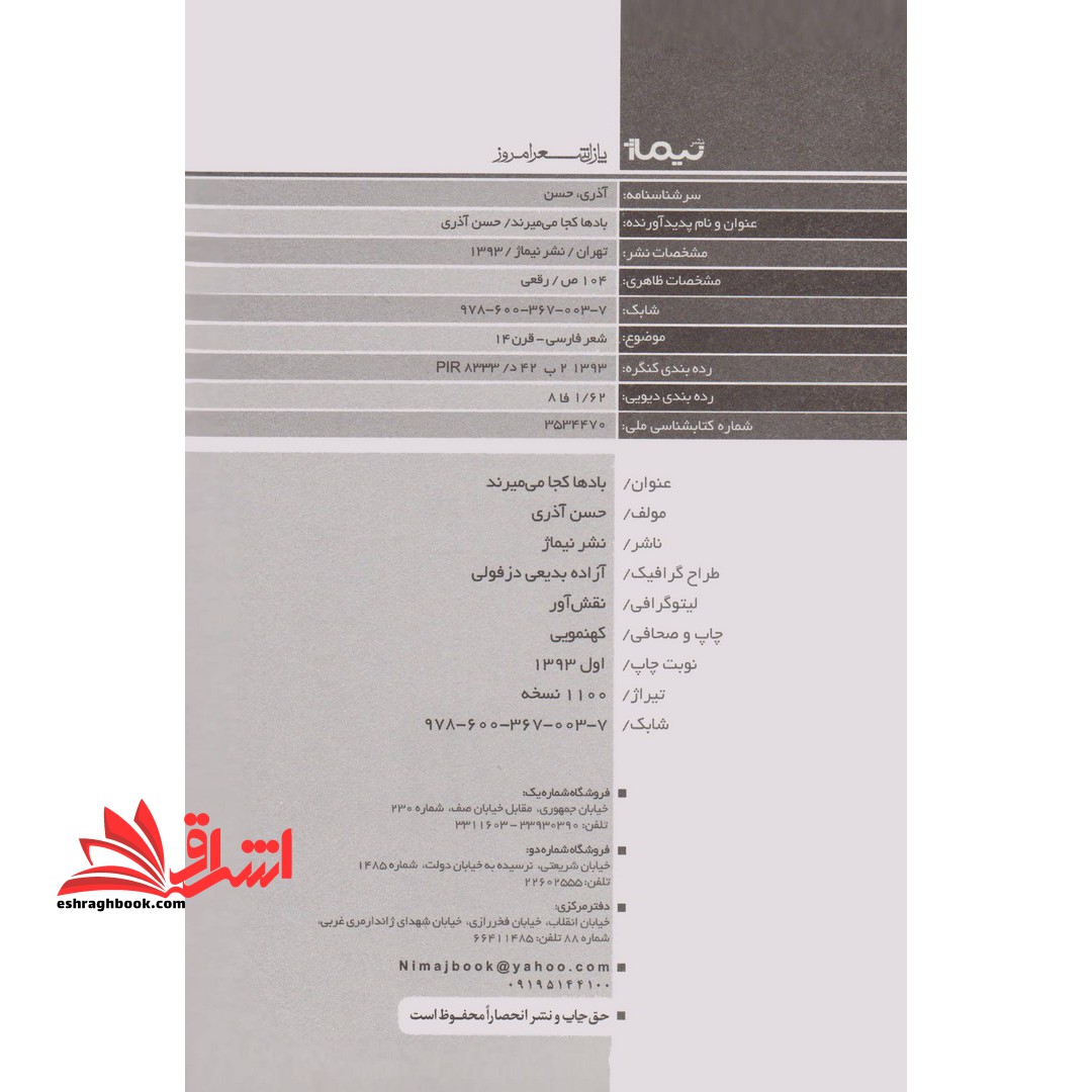 معرفی کتاب بادها کجا می میرند اثر حسن آذری -پانیذ نیک سیر-مجموعه شعری است از حسن آذری شاعر معاصر به چاپ انتشارات نیماژ . شامل چهار دفتر از اشعار آزاد وی به نام های، تنها من می دانم، شما هم بدانید که، چه کسی می داند و هیچ کس نمی داند. حسن آذری به زبان ادبی خود گاه دنیا را به تمسخر می گیرد، گاه اعتراض می کند، گاه امید می بخشد، گاه آگاه می سازد و گاهی عشق را به شیوه ای هنرمندانه به تصویر می کشد. اشعاری که ذهن خواننده را به خود مشغول می دارند و او را غرق در دنیای شاعرانه ی سراینده می کنند.-کتاب بادها کجا می میرند