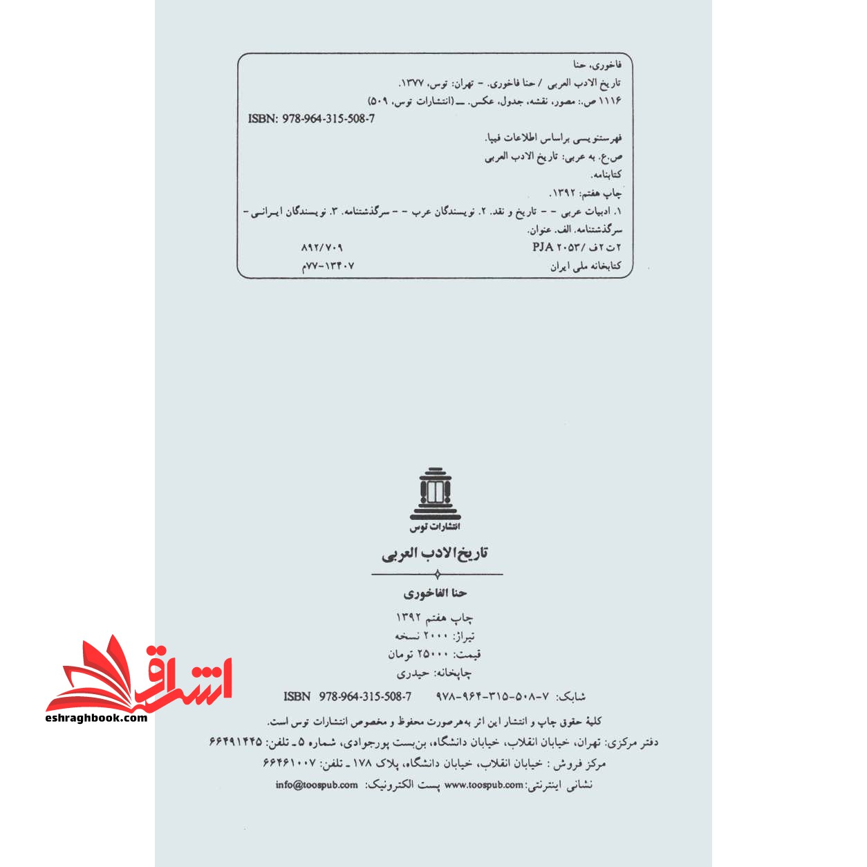 معرفی کتاب تاریخ الادب العربی اثر حنا الفاخوری -پانیذ نیک سیر-همانطوری که می دانیم تمایل به آموختن زبان عربی بین طبقات مختلف جامعه ایران فزونی یافته. این علاقه امری غیر منتظره نیست، زیرا زبان عربی از دیرباز، یعنی حتی پیش از دوره اسلامی، به علل گوناگون، اختلاط و امتزاج فوق العاده ای با زبان فارسی داشته است، که وجود لغات فراوان هر دو زبان در یکدیگر یکی از دلایل این مدعی است و آموزش زبان عربی در حقیقت بخشی از آموزش زبان فارسی به حساب می آید، و بدون اطلاع و آگاهی، ولو جزئی، به این زبان نمی توانیم ادعا کنیم که زبان فارسی، یعنی زبان مادری خود را، بطور کامل می دانیم.چنین بنظرم آمد که برای حل مشکل درس «تاریخ ادبیات» بخصوص با توجه به سرفصل های بسیار متعدد و تقسیم بندیهای جدید، نسخه عربی کتاب تاریخ ادبیات زبان عربی، که ترجمه فارسی آن قبلا توسط موسسه انتشاراتی «توس» انتشار یافته است تجدید چاپ گردد، و بطور فراوان در اختیار دانشجویان رشته ادبیات عربی سراسر کشور قرار گیرد، و بجای جزوه های پراکنده و مقطعی هر فصل و هر درس، یک کتاب واحد باشد؛ و طبق نظر استاد هر فصل (ترم) یک قسمت آن تدریس شود، و حتی پس از فراغ از تحصیل هم مورد استفاده دانشجویان عزیر قرار گیرد. ضمنا استاد، درس خود را به زبان عربی و با استفاده از متن عربی القاء کرده؛ و اگر دانشجو، از نظر معنی یا لغت، با مشکلی روبرو شود می تواند به نسخه فارسی کتاب مراجعه نموده و خود به تحقیق و پیدا کردن معانی جمله و یا لغات بپردازد، که الحق کار دانشگاهی باید چنین باشد! و کلاس بجای پرداختن به امر ترجمه و توضیح لغات؛ کاری که در خارج از کلاس هم ممکن است؛ به اصل مطالب درس، یعنی شرح و بسط مسائل تاریخ ادبیات، بپردازد، و سطح کلاس را بطور چشمگیر بالا برد.-کتاب تاریخ الادب العربی