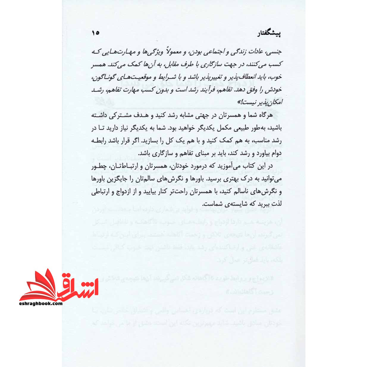 معرفی کتاب تفاهمکتاب تفاهم نوشته شمس الدین حسینی و الهم آرام نیا است. این کتاب به بیان درک تفاوت ها می پردازد و بهترین تفاهم برای افراد را همین در نظر می گیرد. این کتاب یک راهنمای جامع برای زندگی بهتر و آرام تر است.درباره کتاب تفاهم اگر این اصل را بپذیریم که انسان ها با هم متفاوت هستند، می توانیم به طور جدی بررسی کنیم که چقدر با همسرمان تفاوت داریم. هر انسانی منحصربه فرد است و درواقع، طبقه بندی نوع انسان ممکن نیست! اما با درک بیش تر نسبت به تفاوت های مان، نظام طبقه بندی زیر می تواند مفید باشد. کتاب تفاهم یک طبقه بندی کامل از تفاوت آدم ها و ویژگی های رفتاری آن ها است. این کتاب به شما یاد می دهد تفاهم یعنی بتوانید در زندگی با یکدیگر هماهنگ باشید. ممکن است موارد مشابهی وجود داشته باشد که هر دوی شما، یا می پسندید یا نمی پسندید، مواردی که موجب تسهیل ارتباط تان می شود؛ اما، حتی اگر چنین مواردی هم وجود نداشته باشد، بازهم از بودن با یکدیگر لذت می برید، از هم قدردانی می کنید و نسبت به یکدیگر پذیرا هستید.خواندن کتاب تفاهم را به چه کسانی پیشنهاد می کنیماین کتاب را به تمام زوج ها پیشنهاد می کنیمبخشی از کتاب تفاهم. مشاجره و جروبحث را به حالت عادی درآوریددر جروبحث ها و مشاجره های تان، ترس و قدرت را کنار بگذارید و شرایط را به حالت عادی درآورید. زوج هایی که مضطرب می شوند یا از جروبحث های شان فرار می کنند، نمی توانند مشکلات را برطرف کنند! هنگام جروبحث، کنترل تان را حفظ نمایید.وقتی با هم جروبحث می کنید، در زمان حال باقی بمانیددربارهٔ موضوع صحبت کنید: «ببین، می دانم درحال حاضر هر دوی ما عصبانی هستیم اما، می خواهم بدانی دوستت دارم و می خواهم هر دوی ما احساس امنیت کنیم.» این عمل، عشق و صراحت و واقعیت و شور را به رابطه تان بازمی گرداند.