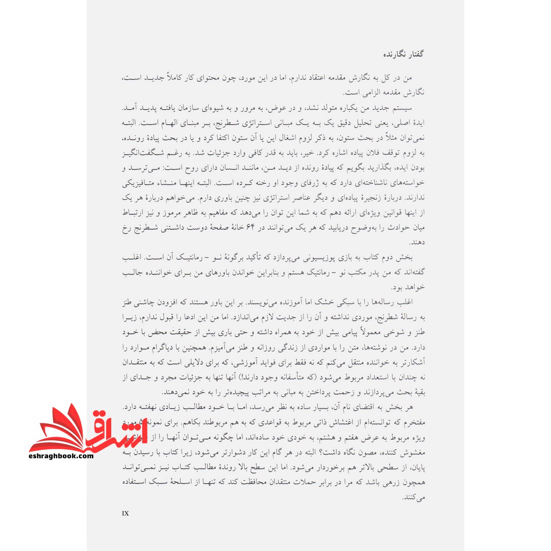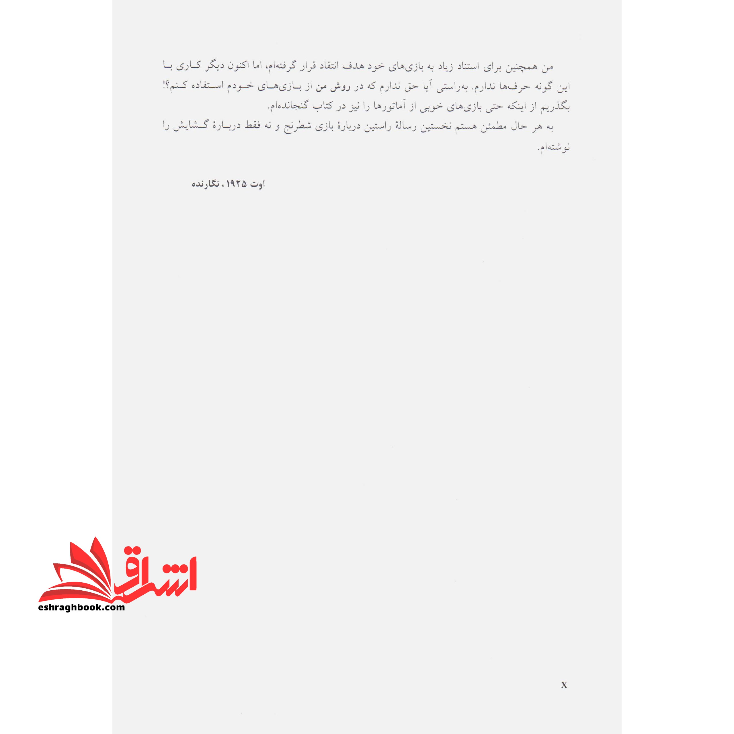 توضیحات اثری است از آرون نیمزوویچ به ترجمه خشایار بهاری و چاپ انتشارات شباهنگ، یکی از بهترین کتاب هایی که در زمینه شطرنج به رشته تحریر در آمده است. اثری که پیچیده ترین بازی ها را با اصول ساده و قاعده مند خود روان می سازد و مخاطب را کمک خواهد کرد قدمی بزرگ به سوی پیشروی و ارتقای سطح خود در این بازی فکری هیجان انگیز کسب کند. مجموعه ای که توانایی افراد را در مدیریت این بازی به دو نیمه پیش از مطالعه و پس از مطالعه تقسیم خواهد کرد و قابلیت های بالایی را به افرادی که از آن بهره می برند اعطا خواهد کرد.ایستادن در یک مسابقه دو برای پاک کردن بینی، هدر دادن وقت گرانبها است، گرچه گرفتن بینی کار بدی نیست، اما اگر بتوان حریف را وادار کرد به گونه ای مشابه، وقت خود را تلف کند، می توان در اشراق پیشی گرفت. مثلا می توان حریف را ناگزیر کرد یک سوار خود را چند بار حرکت دهد. بنابراین اگر بتوان همزمان با اشراق سوار خودی، به یک سوار اشراق یافته حریف حمله کرد، وی ناگزیر از اتلاف وقت خواهد شد.