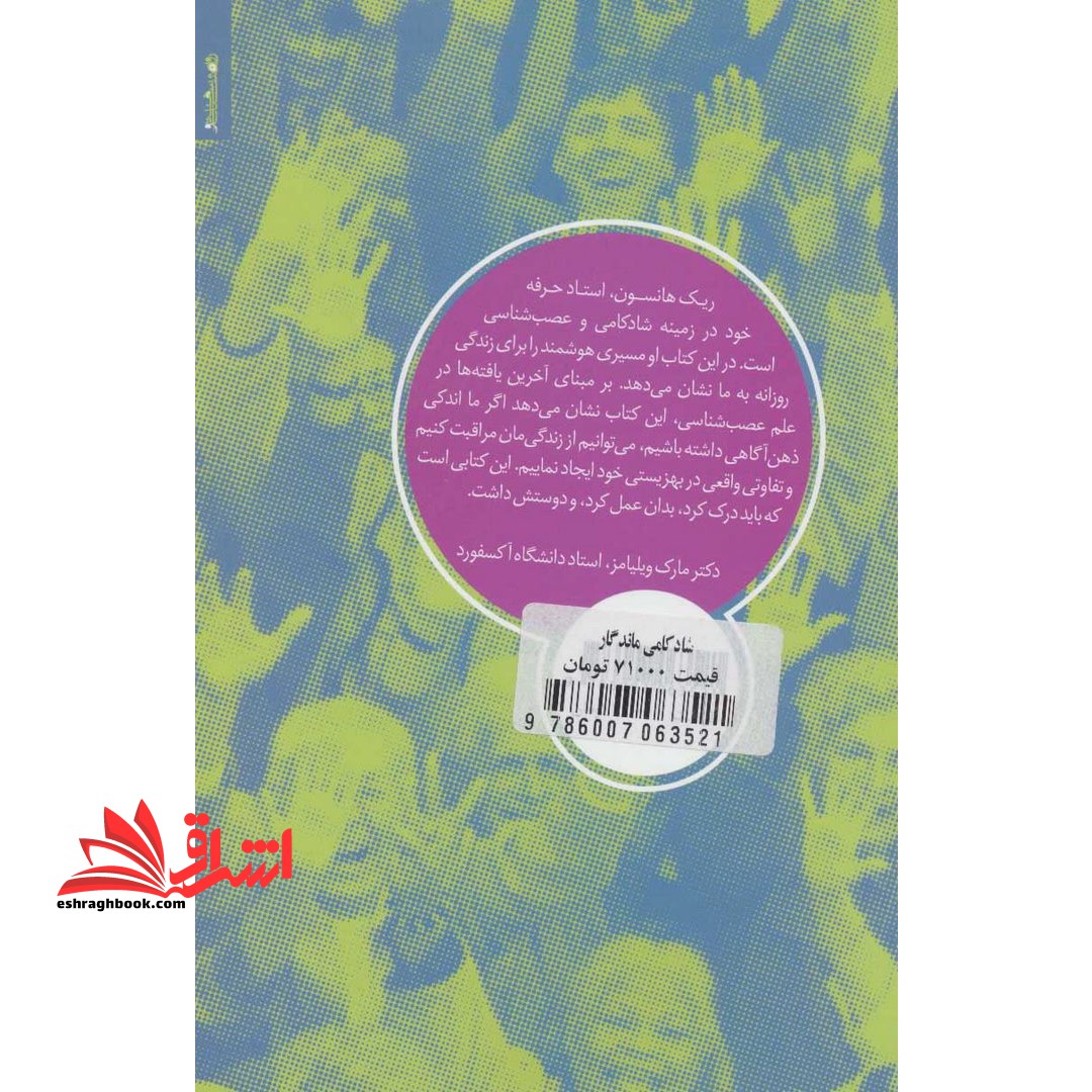 معرفی کتاب شادکامی ماندگارکتاب شادکامی ماندگار نوشته ریک هانسون است که با ترجمه پیمان رحیمی نژاد منتشر شده است. امروزه جهان تشنه شادکامی، امیدواری، آرامش و شفقت است. شاد بودن می تواند یکی از بزرگ ترین مبارزات ما در زندگی باشد. درباره کتاب شادکامی ماندگاربرای شاد بودن باید بر افکار شاد تمرکز کنیم، رنج هایمان را ببینیم و فضایی را به توسعه هیجانات مثبت اختصاص دهیم. احساس شادکامی یک احساس درونی است که با نشاط، خنده، لذت، امید، احساس رضایت و خوش بینی و حس سعادت ورزی همراه است و این احساس مهم هم به صورت گذرا و حسی و هم به صورت بلندمدت و پایدار در فرد به وجود می آید. دکتر ریک هانسون، عصب روان شناس و متخصص علوم اعصاب در دانشگاه برکلی است. او نویسنده آثار مختلف پژوهشی و کتاب هایی پرمخاطب در جهان بوده است. کتاب های ایشان مانند مغز بودایی کاربرد علوم اعصاب در شادکامی، عشق و خردمندی( تاکنون در دنیا به ۲4 زبان ترجمه شده و کتاب شادکامی ماندگار نیز از کتاب های پرطرفدار او در دنیا بوده که به ۲5 زبان دنیا ترجمه شده است.خواندن کتاب شادکامی ماندگار را به چه کسانی پیشنهاد می کنیماین کتاب را به تمام کسانی که به دنبال زندگی شادتر هستند پیشنهاد می کنیم