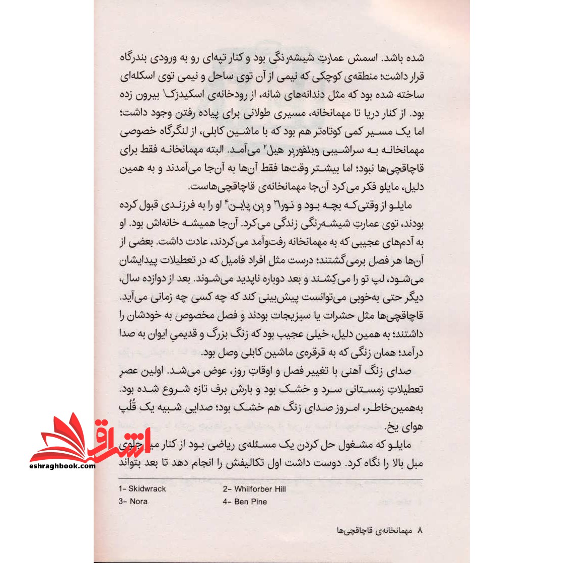 معرفی کتاب مهمانخانه قاچاقچی هاکتاب مهمانخانه قاچاقچی ها نوشته کیف میلفرد و ترجمه فرزانه مختاری است. کتاب مهمانخانه قاچاقچی ها را انتشارات پرتقال منتشر کرده است، این انتشارات با هدف نشر بهترین و با کیفیت ترین کتاب ها برای کودکان و نوجوانان تاسیس شده است. پرتقال بخشی از انتشارات بزرگ خیلی سبز است.درباره کتاب مهمانخانه قاچاقچی هاداستان در مهمانخانه آقا و خانم پاین یا همان مهمانخانه قدیم قاچاقچی ها اتفاق می افتد. تعطیلات کریسمس در پیش است و مایلو پسرخوانده آقا و خانم پاین، برای گذراندن یک تعطیلات آرام و ساکت به آن جا آمده، اما ناگهان در یک نیمه شب خلوت، سروکله پنج مهمان عجیب و مشکوک پیدا می شود. در همین زمان است که مهمان ها ادعا می کنند وسایلشان دزدیده شده است. مایلو و مدی نقشه جالب و مهمی می کشند تا از راز مهمان های مشکوک، که به نوعی با این خانه قدیمی در ارتباط هستند سر در بیاورند. آنها از این مهمان های مشکوک می خواهند هرکدام یک داستان تعریف کنند تا شاید از داستانشان به حقیقت برسند.خواندن کتاب مهمانخانه قاچاقچی ها را به چه کسانی پیشنهاد می کنیماین کتاب برای تمام نوجوانان که عاشق داستان های پر هیجان هستند جذاب است.بخشی از کتاب مهمانخانه قاچاقچی هاآخ! صفتِ قدرتمندِ جوانمرد بودن. مایلو که هنوز غُرغُر می کرد، بلند شد و قوزکرده به سمت مادرش رفت. آرام با خودش می گفت: «تعطیلات، تعطیلات، تعطیلات!» تازه تکالیفش را تمام کرده بود. قرار بود برای مدتی مسئولیتی نداشته باشد.زنگ دوباره به صدا در آمد. مایلو تسلیم نااُمیدی اش شد. وسط سالن ورودی ایستاد؛ یک لنگه چکمه اش را پوشیده بود. دست هایش را کنار بدنش مُشت کرد و با عصبانیت فریاد زد.خانم پاین دست به سینه ایستاده بود تا فریاد مایلو تمام شود. به آرامی پرسید: «حالت بهتر شد؟» مایلو اخم کرد. مادرش گفت: «می دونم که این روال عادی نیست؛ و می دونم از این که کارها طبق انتظارت پیش نره، خوشت نمی آد.» خم شد و توی جعبهٔ خِرت وپِرت ها که کنار در بود، دنبال چراغ قوه گشت. «ولی ببین، غافلگیر شدن همیشه هم بد نیست.»البته که منطقی به نظر رسیدنِ این موضوع، حس مایلو را بهتر نمی کرد؛ اما سرش را تکان داد و لباس پوشیدنش تمام شد. همراه مادرش به ایوان رفتند، از چمنزار رد شدند و به طرف فضای خالی بین درخت های توسِ سفیدِ بی شاخ وبرگ و درخت های نراد آبی سبز رفتند که دامنهٔ تپه را پوشانده بودند. آن جا که شبیه دریایی از سایه و تاریکی بود، چمنزار به زمینی سنگی ختم می شد.مایلو در کل زندگی اش، از همان وقتی که خیلی کوچک بود، از تغییرات ناگهانی برنامه خیلی اذیت می شد؛ چیزی فراتر از اذیت شدن. غافلگیر شدن حتی در بهترین زمان هم او را نگران می کرد. حالا توی برف های تازه، در سرمای شدید به سختی قدم برمی داشت تا غریبه ای را به بالای تپه بکِشَد؛ غریبه ای ناخوانده که به خاطر او مجبور می شد کار کند؛ آن هم وقتی که واقعاً می خواست یک هفته ای را آرام در کنار پدر و مادرش بگذراند و خانه شان برای خودشان باشد. خُب، این موضوع، حس نگرانی را تبدیل به ترس می کرد.نور چراغ قوه، آن دریای سایه و تاریکی را شکافت. تاریکی با سوسوی نور، طلایی رنگ شد؛ خانم پاین چراغ آلاچیق کوچکِ مخفی بین درخت ها را روشن کرده بود؛ جایی که ماشین کابلی مسافرها را پیاده می کرد.راه آهن از صدمتر پایین تر از رودخانه شروع می شد، اما راه های دیگری هم برای رسیدن به پایین تنگه یا برای بالا آمدن از آن وجود داشت: سراشیبی و پلکانی پیچ درپیچ که تقریباً به موازات راه آهن، به همین آلاچیق می رسید و همین طور جادهٔ مارپیچ دیگری که از مهمانخانه شروع می شد و از کنار تپه پایین می رفت؛ به جایی که شهر در آن جا بود و با ماشین، حدود بیست دقیقه ای راه می شد. البته فقط مایلو، پدر و مادرش و سرآشپز مهمانخانه، خانم کاراوِی۷ از آن جاده استفاده می کردند. مهمان ها از مسیر شهر به آن جا نمی آمدند. مهمان ها از رودخانه می آمدند؛ بعضی وقت ها با قایق های خودشان و بعضی وقت ها هم با پول دادن به یک