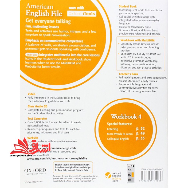 ?کتاب American English File یک دوره شش سطحی آموزش زبان انگلیسی برای بزرگسالان است که توانسته موفقیت های بسیاری را کسب کند. این کتاب در بسیاری از آموزشگاه های نه تنها ایران بلکه سرتاسر جهان تدریس می شود، زیرا همانطور که بر همگان روشن است، مکالمه و گفتار یکی از مهم ترین جنبه های یادگیری زبان است، و این مجموعه نیز به تقویت گفتار و مکالمه براساس لهجه آمریکایی می پردازد.